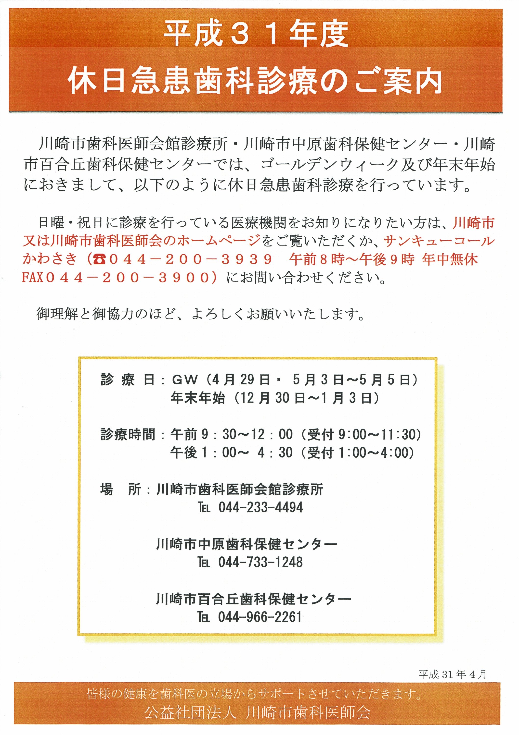 また、休診中は歯科保健センターにて休日診療を行っておりますので、期間中お困りの時はご利用くださいませ。