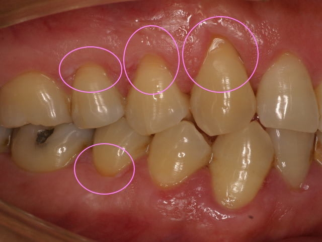 強く歯ブラシをあてることにより歯肉がさがり、歯の根元の象牙質が削れる