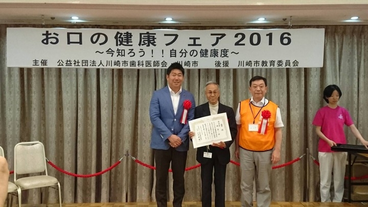 川崎市内の全歯科医院より、推薦を受けた全身の健康はもとより歯の健康状態が優れた方々に贈られる表彰状です。