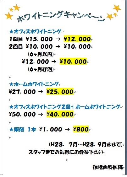 7月1日から9月30日まで、ホワイトニングキャンペーンも実施しております。