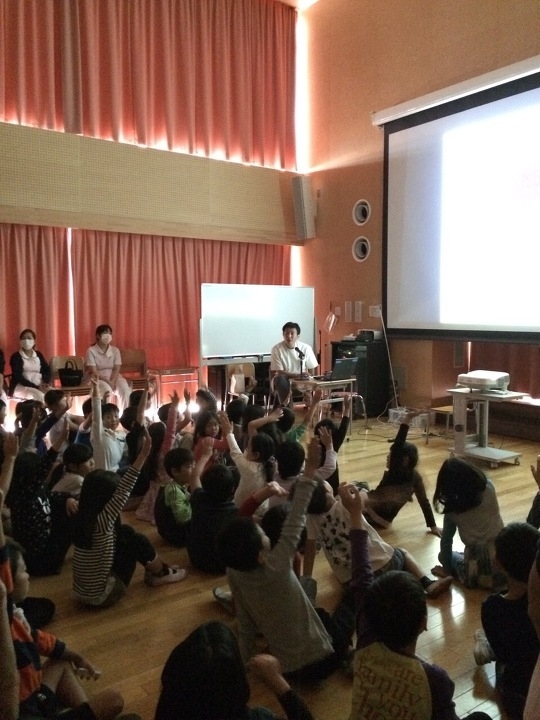 まず初めは、視聴覚室に全員集合で映像やクイズを交えながら院長と一緒に歯のお勉強をしてもらいました。その後は各教室に戻り各自歯ブラシの実習です。